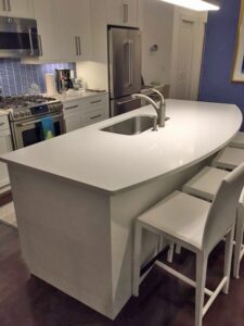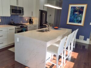 Without changing most of the existing kitchen, the addition of the waterfall kitchen countertop was able to create a dramatic look. The client also wanted a true eat-in island counter, so an over hand was added to create the extra space. The client got a fresh, modern new look with functionality, too!