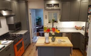 Classic shades of gray cabinets and countertops created a clean, contemporary look. A big pop of color was added to the neutral palette, with an orange oven, proving even a small space can still be dramatic.